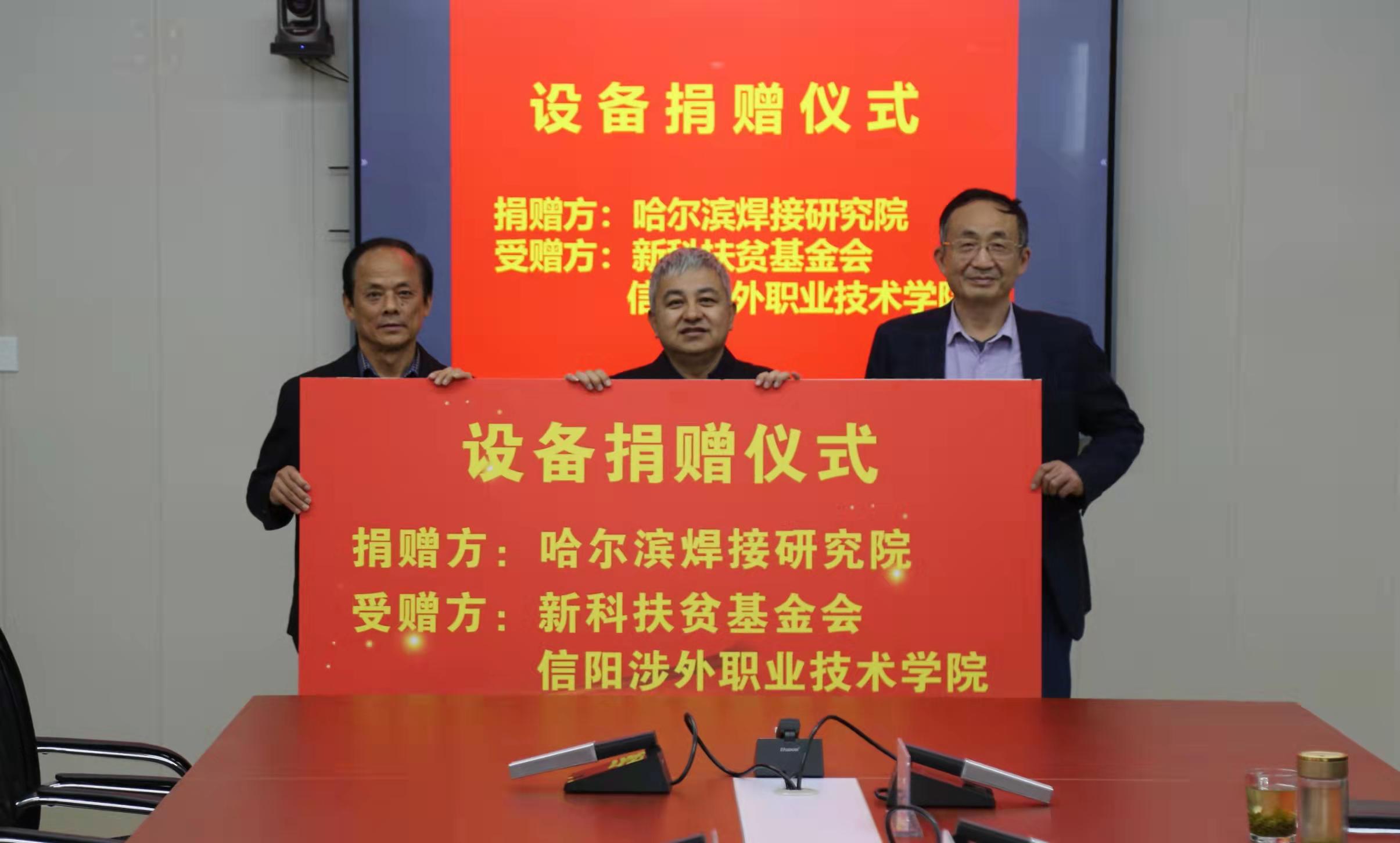 座談會上,劉偉副院長匯報了學院近年來發展情況和哈焊院對口幫扶學院工作開展情況。陳健總經濟師就信陽學院關于加強焊接專業人才培養和專業建設等方面提出了建議,并代表哈焊院向信陽學院定向捐贈了焊接耗材、教學實踐焊接專用設備。吳成才理事長表示,新科扶貧基金會將切實加強對捐贈設備、資金的監督管理,確保專款、專賬、專用,做到不截留、不扣除、不延時。李太福董事長向中國機械總院、哈爾濱焊接研究院和新科扶貧基金會長期來對學院發展的支持表示衷心感謝,并就加強學院焊接專業建設、共建產業學院、搭建高質量實習就業平臺交流了意見和建議。三方舉行了設備捐贈儀式。
