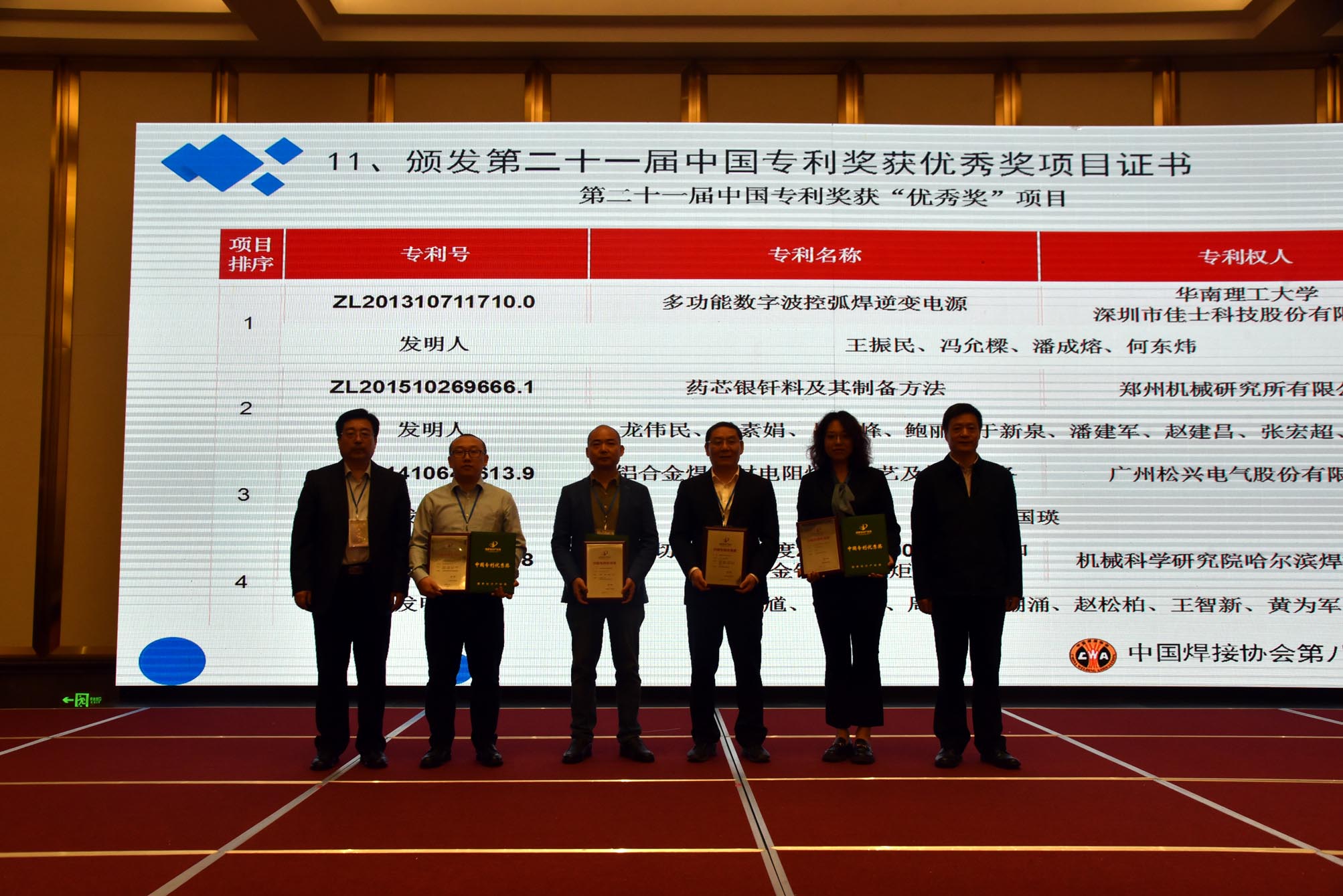 中國焊接協(xié)會會長俞培根、副會長楊玉亭分別為榮獲“第二十一屆中國專利優(yōu)秀獎”的深圳市佳士科技股份有限公司、鄭州機(jī)械研究所有限公司、廣州松興電氣股份有限公司、哈爾濱焊接研究院有限公司,頒發(fā)了第二十一屆中國專利獎獲優(yōu)秀獎項目證書。