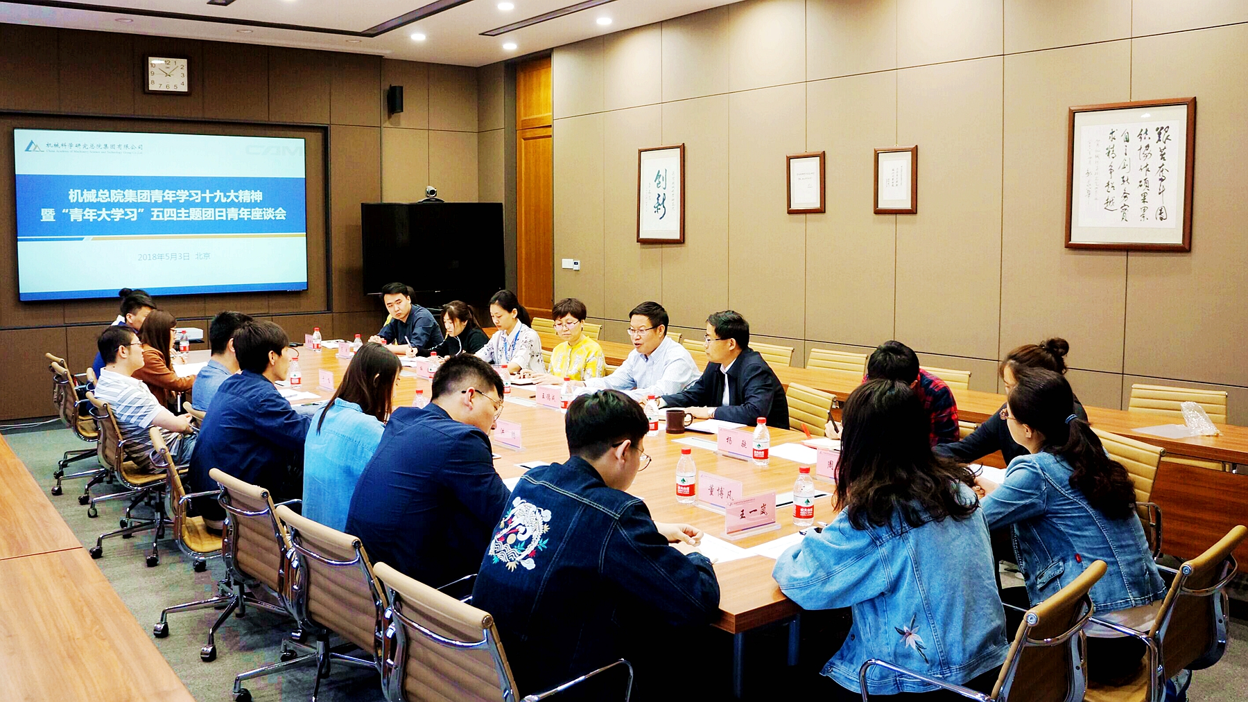 2018年5月3日,機械總院集團青年學習十九大精神暨“青年大學習”五四主題團日座談會在京召開,集團黨委書記、董事長王德成,黨委委員、副總經理單忠德,團委書記李東方以及青年員工代表19人出席了本次會議,會議由單忠德副總經理主持。